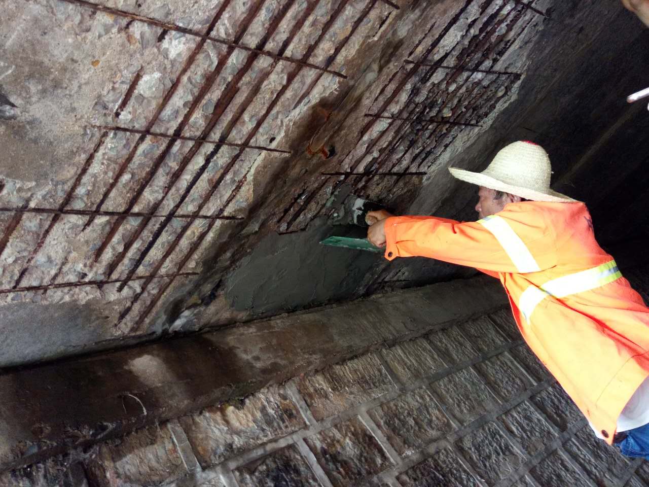 三、施工 1. 将结构受损处松散混凝土和骨料颗粒凿除,并采用真空吸尘器清理缺损区域碎屑、灰尘等杂物。 2. 如有钢筋露出,对钢筋进行除锈、防锈处理,分次涂刷防锈剂。 3. 根据需要,在混凝土破损部位支立模板。 4. 在修补混凝土暴露面涂刷底涂材料。 5.